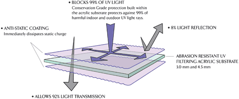 • Anti-static protection that actually exceeds glass and dissipates 2000 times more static than regular acrylic, making it safe for friable media and minimizing cleaning.